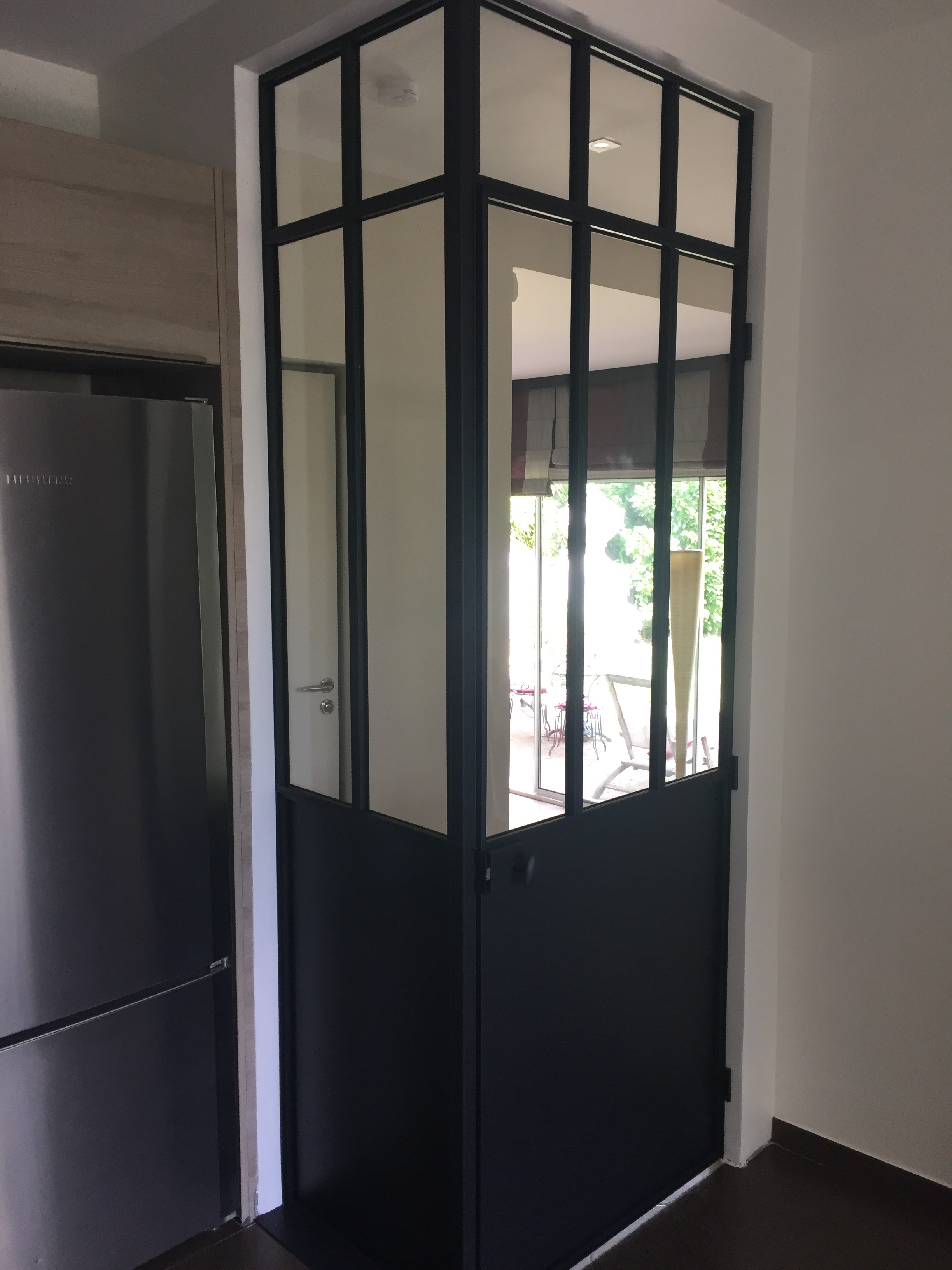 Très belle réalisation d’une verrière d’intérieur en séparation de 2 pièces. Forme très simple et très discrète. Installation parfaite : la verrière semble avoir été présente depuis toujours.